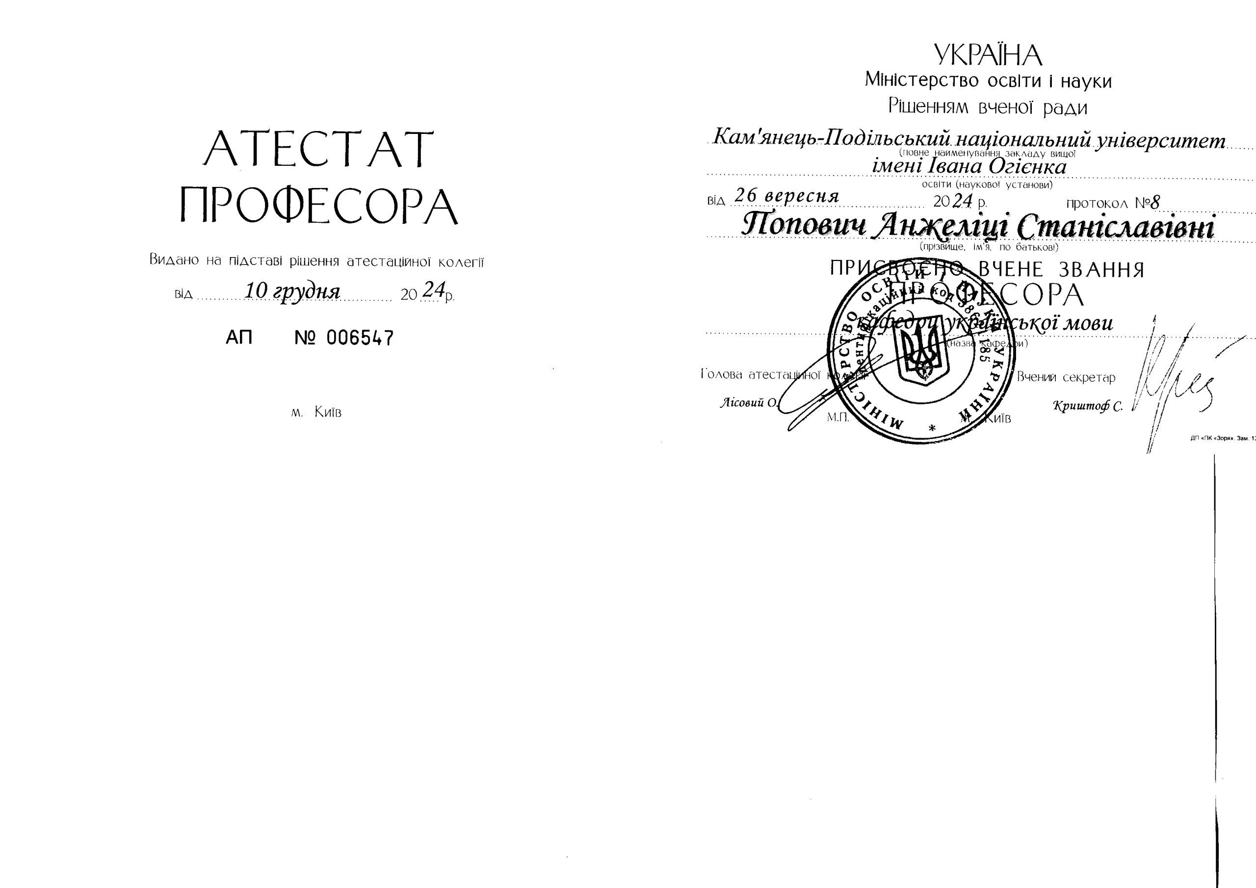26 грудня 2024 року на засіданні вченої ради університету ректор Сергій Копилов вручив атестат професора Анжеліці Станіславівні Попович, докторові філологічних наук, доценту кафедри української мови.
